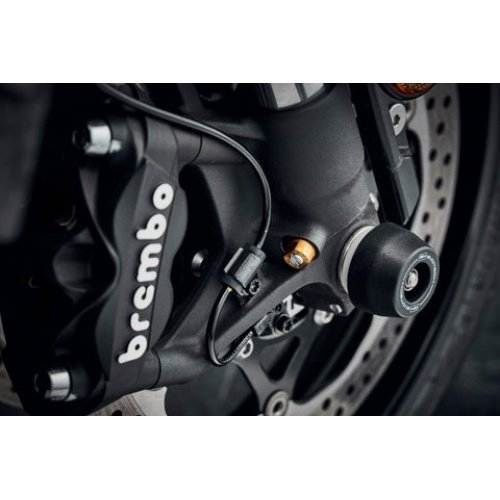 The Evotech Performance Front Axle Sliders help protect your forks, brake calipers and axle in the event of a crash. Nylon sliders stick out from an aluminum inner to take the initial impact. Each slider is able to rotate freely to help reduce wear and damage in a slide.
