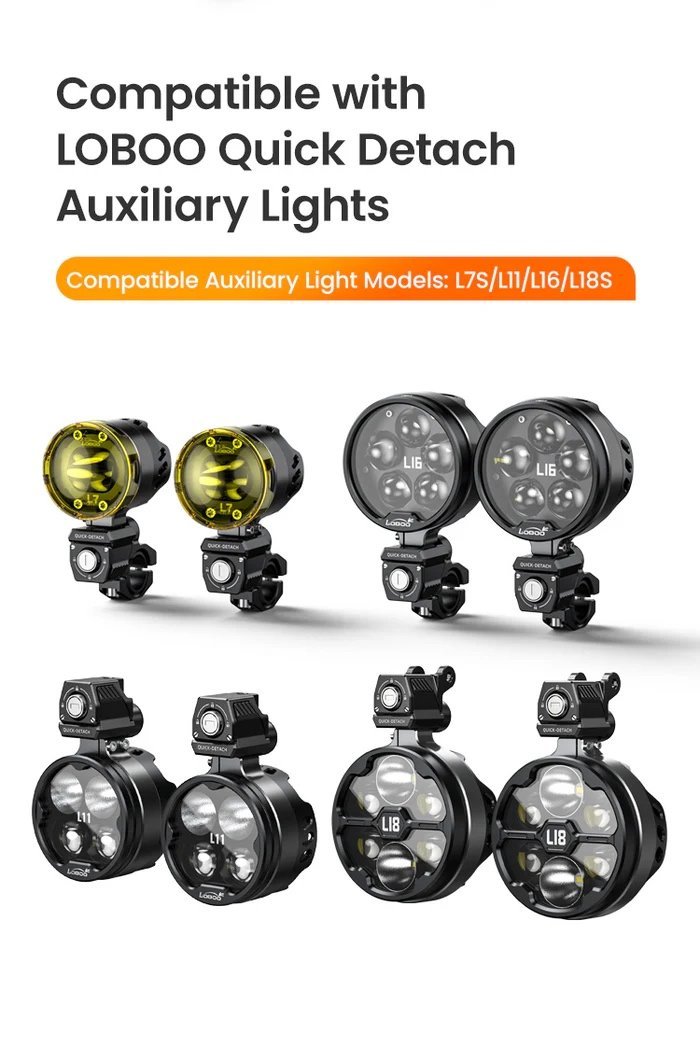 Q7S Universal Quick‑Detach Lights Mount is a rugged mounting solution that lets you snap on/off LOBOO auxiliary lights instantly—no tools required. Designed for adventure and touring riders, it supports seamless switching between bikes or removal for off-bike security.